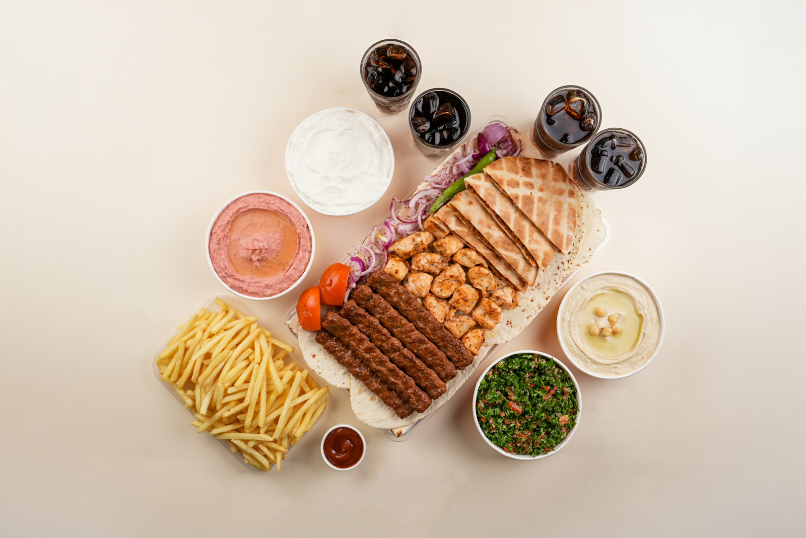 8 skewer meat kebab, 4 skewer tawook, 2 arayes bread, hummus, mutabbal, tabboula, french fries and coca-cola
