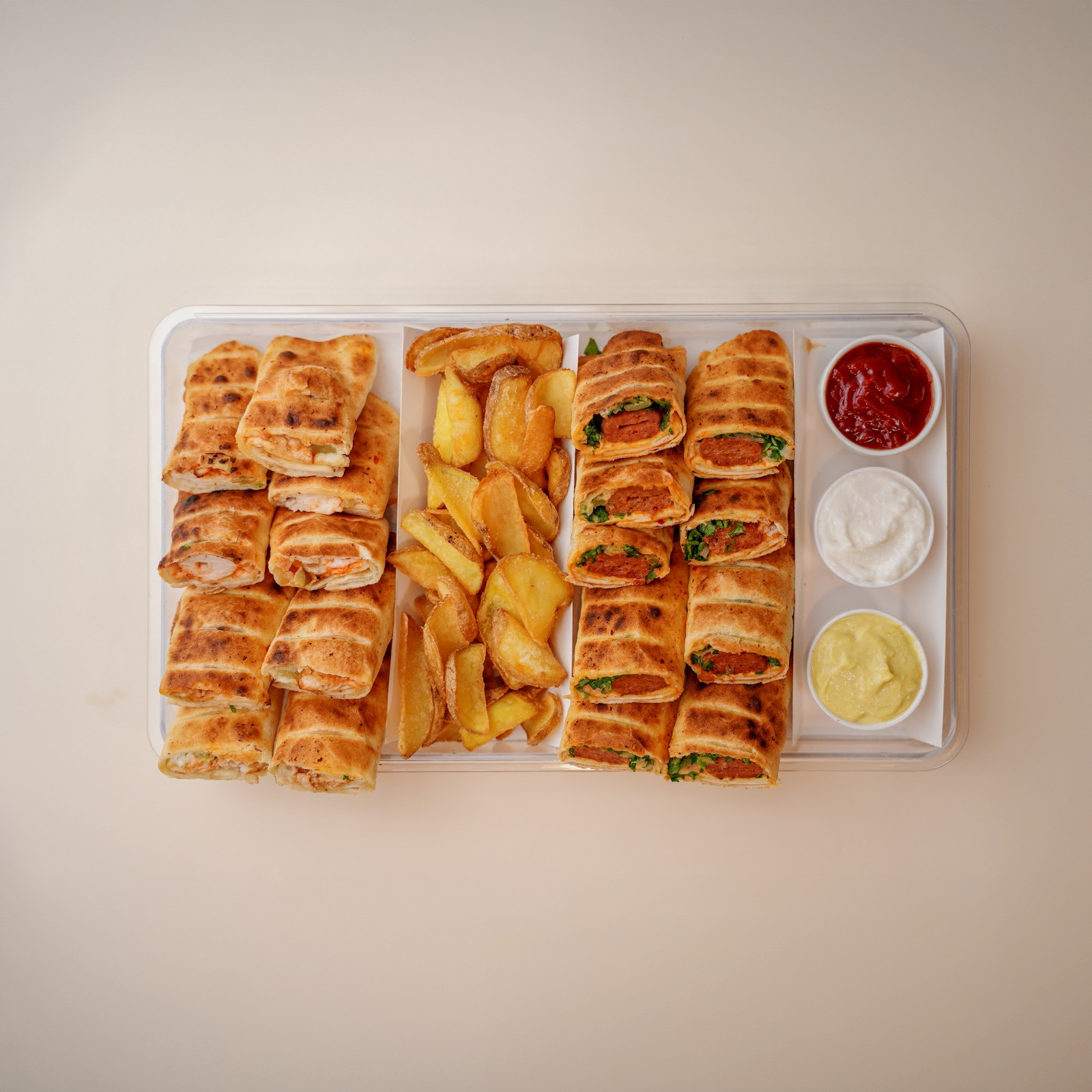 Choose any 6 Lavash Rolls of your choice all cut in half served with fries and 2 dips